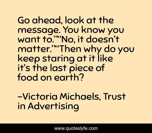 This page presents the quote "Go ahead, look at the message. You know you want to.”“No, it doesn’t matter.”“Then why do you keep staring at it like it’s the last piece of food on earth?". Author of this quote is Victoria Michaels, Trust in Advertising. .