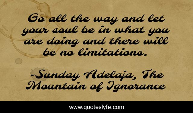 This page presents the quote "Go all the way and let your soul be in what you are doing and there will be no limitations.". Author of this quote is Sunday Adelaja, The Mountain of Ignorance. This quote is about limitations, life, darkness, limits, danger, determined-spirit, god, people, ignorance,.
