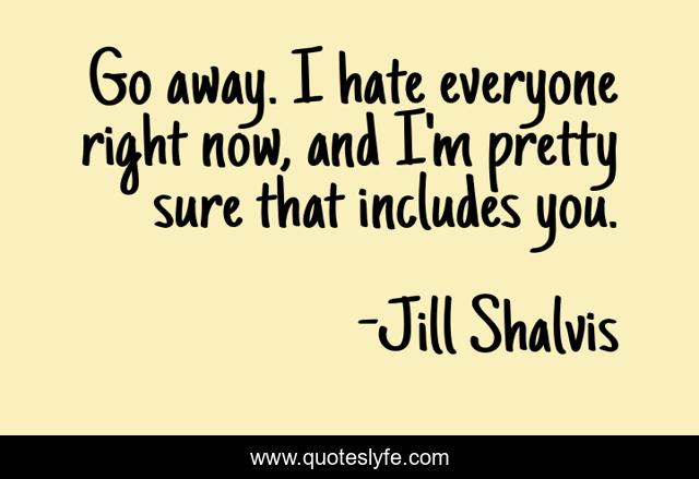 This page presents the quote "Go away. I hate everyone right now, and I'm pretty sure that includes you.". Author of this quote is Jill Shalvis. This quote is about solitary, hurting, hate,.