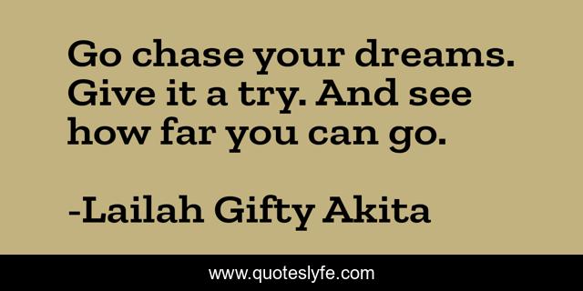 This page presents the quote "Go chase your dreams. Give it a try. And see how far you can go.". Author of this quote is Lailah Gifty Akita. This quote is about determination, inspirational, enthusiasm, chase, dreams, you-can,.