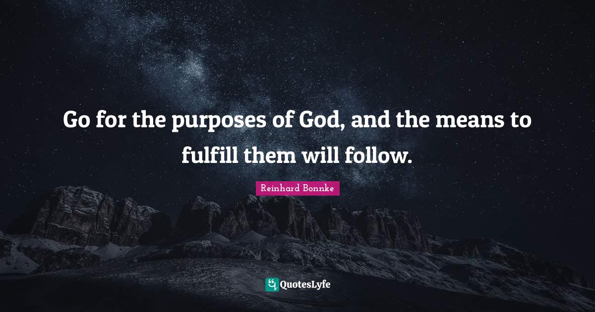 This page presents the quote "Go for the purposes of God, and the means to fulfill them will follow.". Author of this quote is Reinhard Bonnke. This quote is about purpose, purpose of god, mean, god,.
