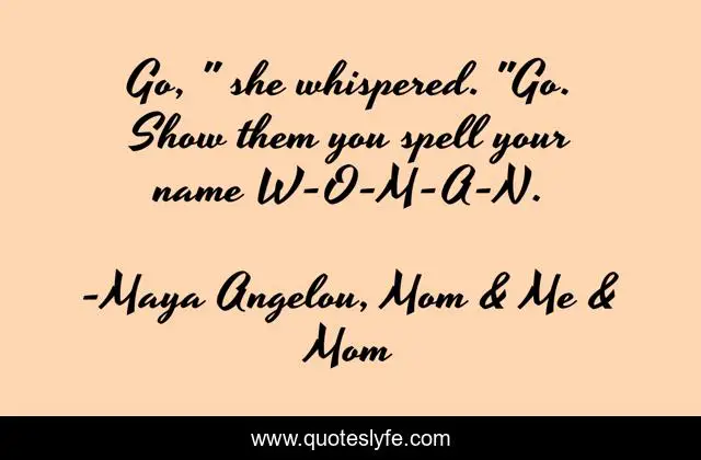 This page presents the quote "Go, " she whispered. "Go. Show them you spell your name W-O-M-A-N.". Author of this quote is Maya Angelou, Mom & Me & Mom. This quote is about enthusiasm, our-shared-shelf, feminism, inspirational,.