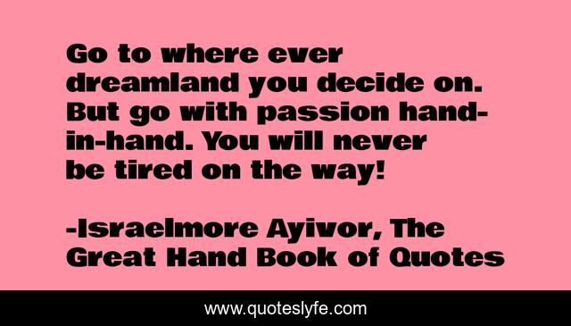 This page presents the quote "Go to where ever dreamland you decide on. But go with passion hand-in-hand. You will never be tired on the way!". Author of this quote is Israelmore Ayivor, The Great Hand Book of Quotes. This quote is about move-with-passion, tired, hand-in-hand, desperate, go, worn-out, be-desperate, food-for-thought, dare-to-be,.