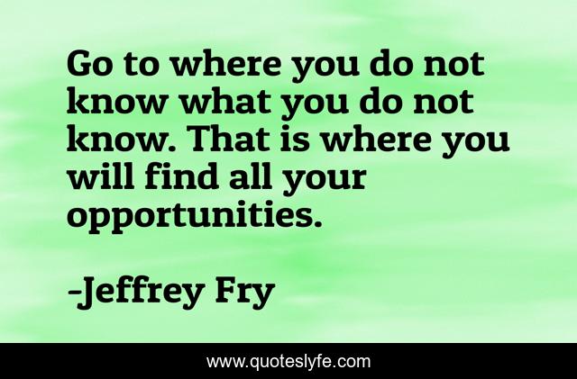 This page presents the quote "Go to where you do not know what you do not know. That is where you will find all your opportunities.". Author of this quote is Jeffrey Fry. This quote is about all, go-to, find, opportunities, do-not-know,.