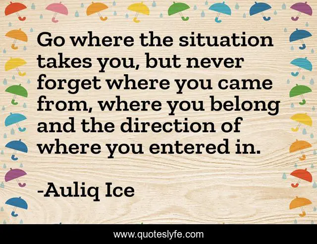 This page presents the quote "Go where the situation takes you, but never forget where you came from, where you belong and the direction of where you entered in.". Author of this quote is Auliq Ice. This quote is about home, love, success, affection,.