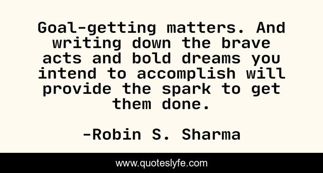 This page presents the quote "Goal-getting matters. And writing down the brave acts and bold dreams you intend to accomplish will provide the spark to get them done.". Author of this quote is Robin S. Sharma. This quote is about brave, bold, writing,.