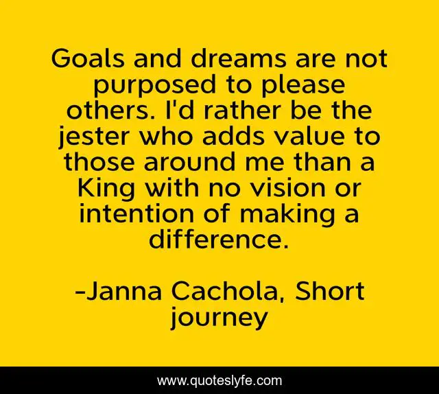 This page presents the quote "Goals and dreams are not purposed to please others. I'd rather be the jester who adds value to those around me than a King with no vision or intention of making a difference.". Author of this quote is Janna Cachola, Short journey. This quote is about follow-your-heart, dream-big, boss-lady, fearless, achieve, you-can-do-it, boss, journey, determination,.