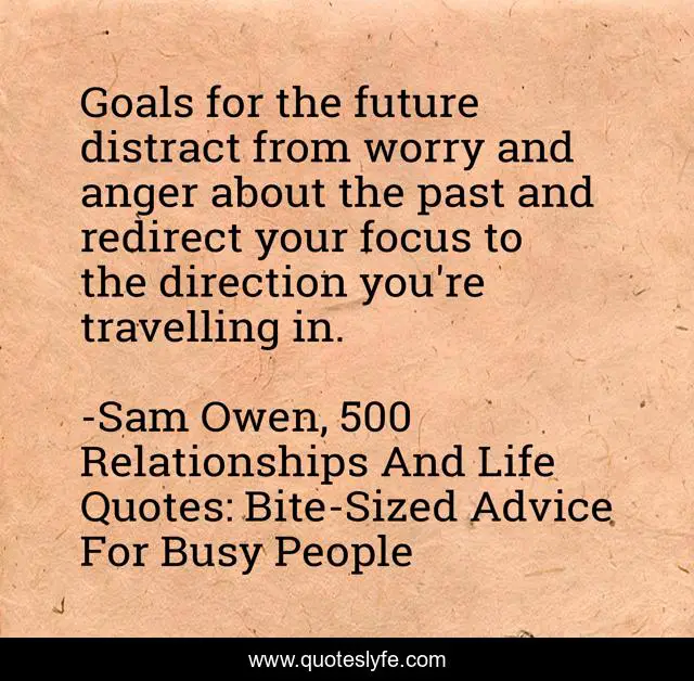 This page presents the quote "Goals for the future distract from worry and anger about the past and redirect your focus to the direction you're travelling in.". Author of this quote is Sam Owen, 500 Relationships And Life Quotes: Bite-Sized Advice For Busy People. This quote is about relationships, psychology, focus, emotions, redirection, goals, anger, worry, distraction,.