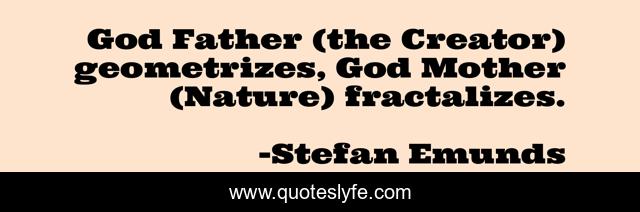 This page presents the quote "God Father (the Creator) geometrizes, God Mother (Nature) fractalizes.". Author of this quote is Stefan Emunds. This quote is about goddess, religion, god, creation, metaphysical, wisdom, spirituality, mysticism, universe,.
