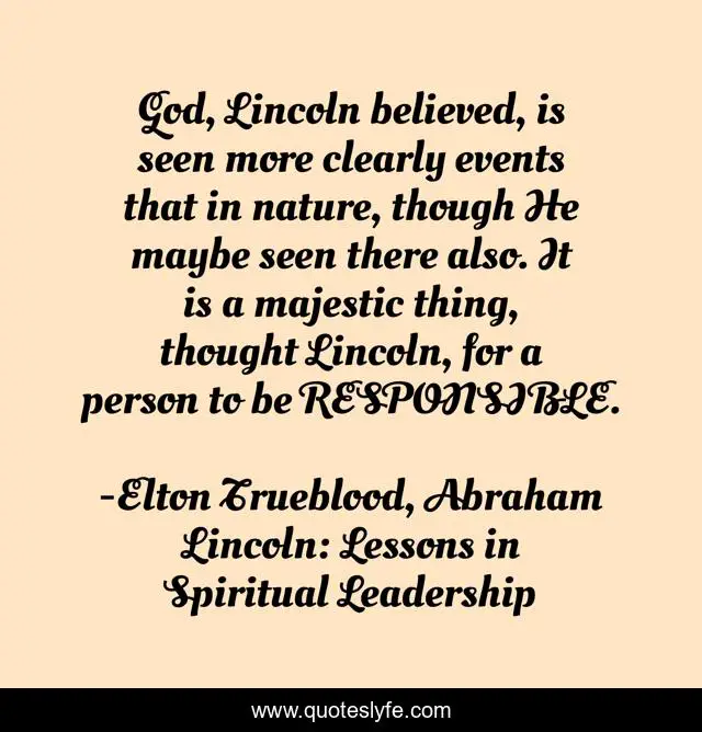This page presents the quote "God, Lincoln believed, is seen more clearly events that in nature, though He maybe seen there also. It is a majestic thing, thought Lincoln, for a person to be RESPONSIBLE.". Author of this quote is Elton Trueblood, Abraham Lincoln: Lessons in Spiritual Leadership. This quote is about will-of-god, sovereignty-of-god, theology,.