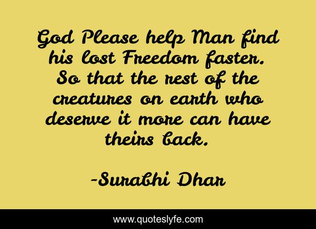 This page presents the quote "God Please help Man find his lost Freedom faster. So that the rest of the creatures on earth who deserve it more can have theirs back.". Author of this quote is Surabhi Dhar. This quote is about freedom, spiritual, animals, man,.