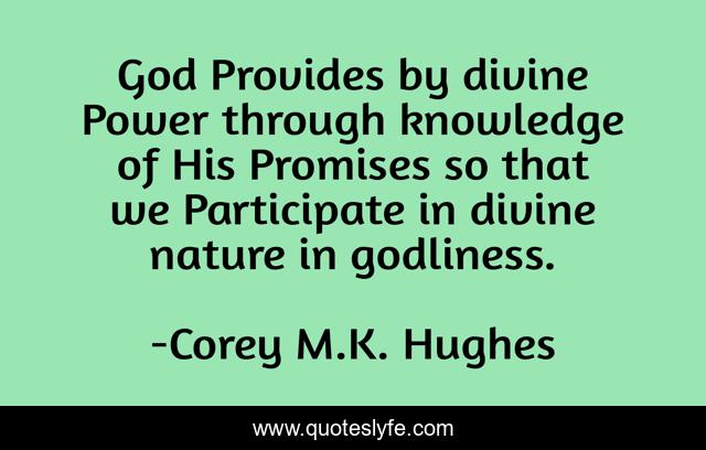 This page presents the quote "God Provides by divine Power through knowledge of His Promises so that we Participate in divine nature in godliness.". Author of this quote is Corey M.K. Hughes. This quote is about gods-promises, bible, christian, divine-power, divine-nature, 2-peter-1-4, participate-in-divine-nature, christian-behavior, gods-provision,.