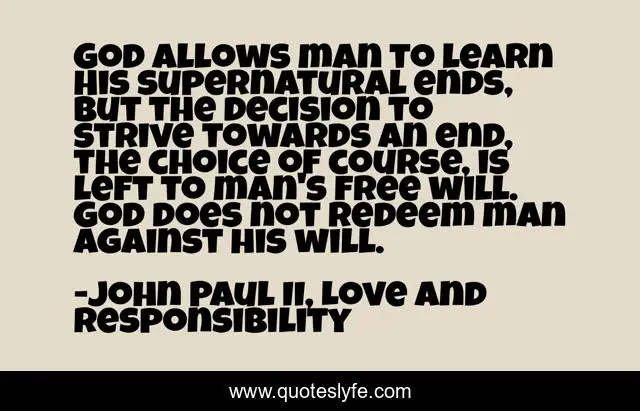This page presents the quote "God allows man to learn His supernatural ends, but the decision to strive towards an end, the choice of course, is left to man's free will. God does not redeem man against his will.". Author of this quote is John Paul II, Love and Responsibility. This quote is about free-will, vocation, salvation, redemption,.
