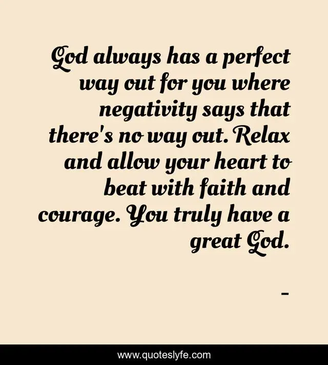 This page presents the quote "God always has a perfect way out for you where negativity says that there's no way out. Relax and allow your heart to beat with faith and courage. You truly have a great God.". Author of this quote is . This quote is about edmond-mbiaka, there-is-always-a-way-out, faith-and-courage, you-have-a-great-god, god-has-a-perfect-way-for-you,.