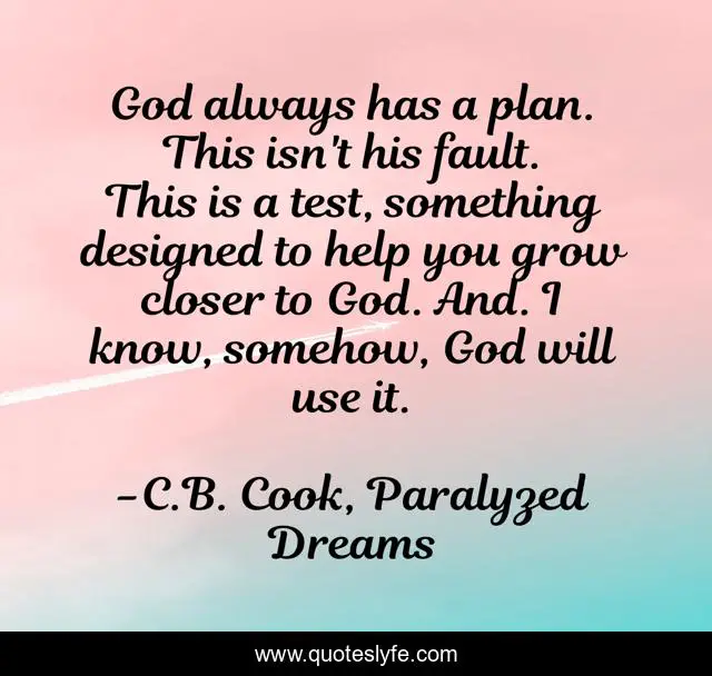 This page presents the quote "God always has a plan. This isn't his fault. This is a test, something designed to help you grow closer to God. And. I know, somehow, God will use it.". Author of this quote is C.B. Cook, Paralyzed Dreams. This quote is about hard-times, faith, tests, perseverance, god, difficulties, inspirational, growing, enthusiasm,.