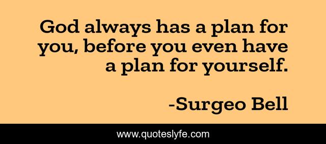 This page presents the quote "God always has a plan for you, before you even have a plan for yourself.". Author of this quote is Surgeo Bell. This quote is about life, plans, god, yourself, dont-give-up, life-lessons,.