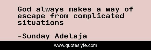 This page presents the quote "God always makes a way of escape from complicated situations". Author of this quote is Sunday Adelaja. This quote is about complication, god, calling, purpose, way, escape, situation, fulfillment,.