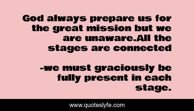 This page presents the quote "God always prepare us for the great mission but we are unaware.All the stages are connected". Author of this quote is we must graciously be fully present in each stage.. This quote is about lailah gifty akita, pearls of wisdom: great mind,.