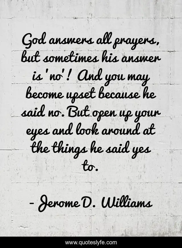 "Jerome D. Williams Quotes." Quoteslyfe.com, 2025. Fri. 05 Dec. 2025. <https://www.quoteslyfe.com/quote/God-answers-all-prayers-but-sometimes-his-197121>.