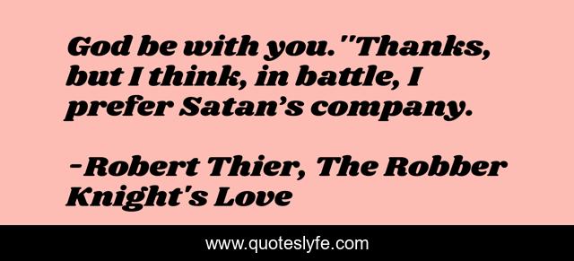 This page presents the quote "God be with you.''Thanks, but I think, in battle, I prefer Satan’s company.". Author of this quote is Robert Thier, The Robber Knight's Love. This quote is about battle, god, satan, war, fighting,.