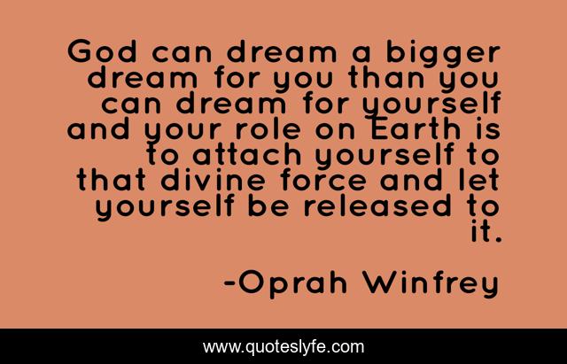 This page presents the quote "God can dream a bigger dream for you than you can dream for yourself and your role on Earth is to attach yourself to that divine force and let yourself be released to it.". Author of this quote is Oprah Winfrey. .