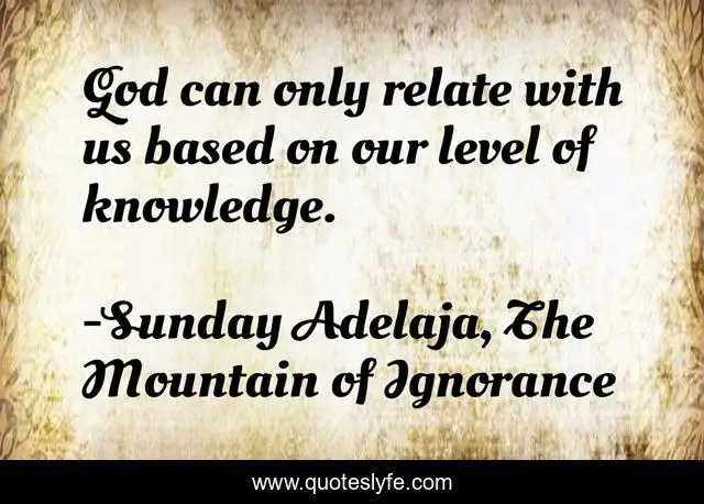 This page presents the quote "God can only relate with us based on our level of knowledge.". Author of this quote is Sunday Adelaja, The Mountain of Ignorance. This quote is about mountain, life, darkness, power, danger, god, people, ignorance, relationship,.