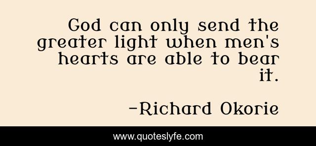 This page presents the quote "God can only send the greater light when men's hearts are able to bear it.". Author of this quote is Richard Okorie. This quote is about life, communion, successful-living, success, life-changing,.