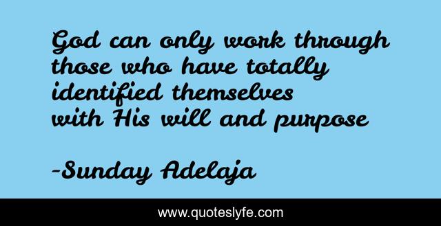 This page presents the quote "God can only work through those who have totally identified themselves with His will and purpose". Author of this quote is Sunday Adelaja. This quote is about god, work, totally, identified, purpose,.