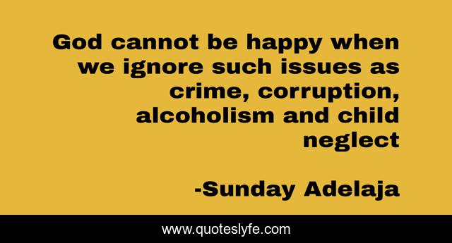 This page presents the quote "God cannot be happy when we ignore such issues as crime, corruption, alcoholism and child neglect". Author of this quote is Sunday Adelaja. This quote is about god, alcoholism, crime, ignore, corruption, child, neglect, happy,.