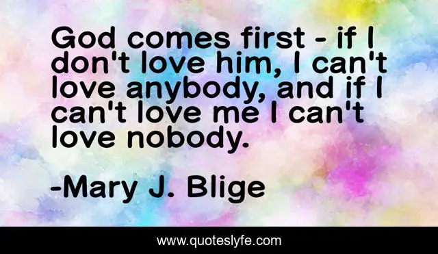 This page presents the quote "God comes first - if I don't love him, I can't love anybody, and if I can't love me I can't love nobody.". Author of this quote is Mary J. Blige. This quote is about me, love, love me, affection,.