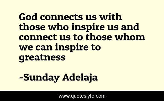 This page presents the quote "God connects us with those who inspire us and connect us to those whom we can inspire to greatness". Author of this quote is Sunday Adelaja. This quote is about greatness, inspire, connect,.