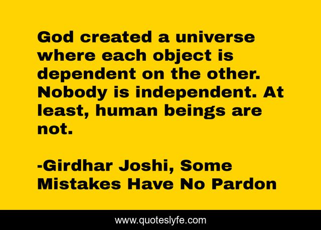 This page presents the quote "God created a universe where each object is dependent on the other. Nobody is independent. At least, human beings are not.". Author of this quote is Girdhar Joshi, Some Mistakes Have No Pardon. This quote is about dependent, independent, universe,.