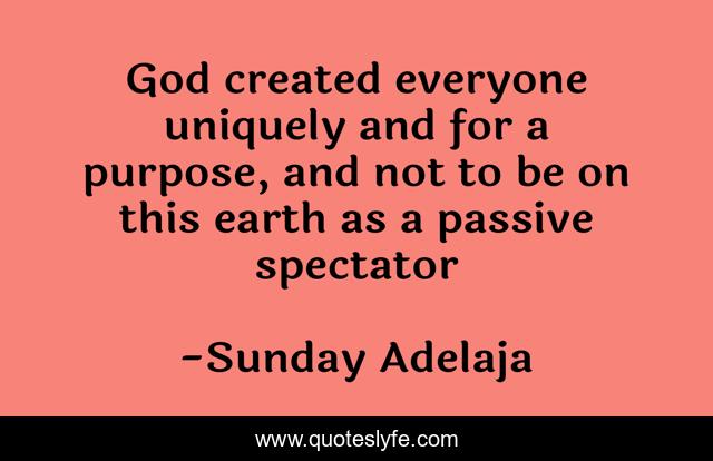 This page presents the quote "God created everyone uniquely and for a purpose, and not to be on this earth as a passive spectator". Author of this quote is Sunday Adelaja. This quote is about god, calling, passive, purpose, spectator, earth, unique, fulfillment,.