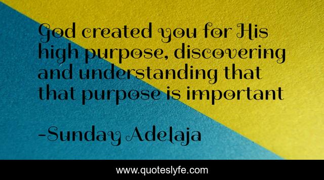 This page presents the quote "God created you for His high purpose, discovering and understanding that that purpose is important". Author of this quote is Sunday Adelaja. This quote is about life, creator, self-discovery, creation, calling, truth, god, understanding-purpose,.