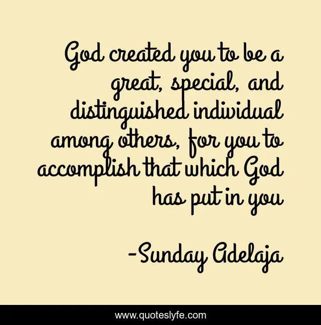 This page presents the quote "God created you to be a great, special, and distinguished individual among others, for you to accomplish that which God has put in you". Author of this quote is Sunday Adelaja. This quote is about purpose, calling-fulfillment, life, goals,.
