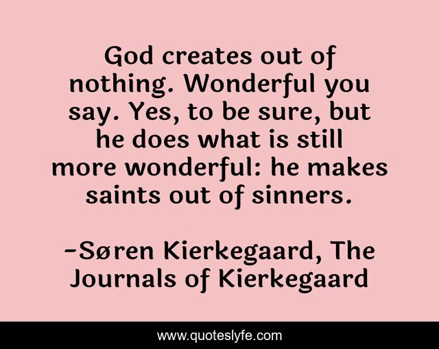 This page presents the quote "God creates out of nothing. Wonderful you say. Yes, to be sure, but he does what is still more wonderful: he makes saints out of sinners.". Author of this quote is Søren Kierkegaard, The Journals of Kierkegaard. This quote is about god, saints, redemption, sinners,.