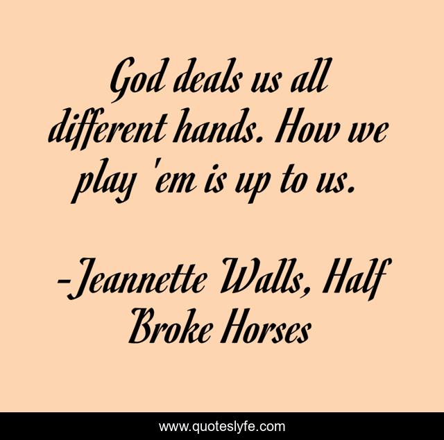 This page presents the quote "God deals us all different hands. How we play 'em is up to us.". Author of this quote is Jeannette Walls, Half Broke Horses. This quote is about cards, god, game, life, hands,.