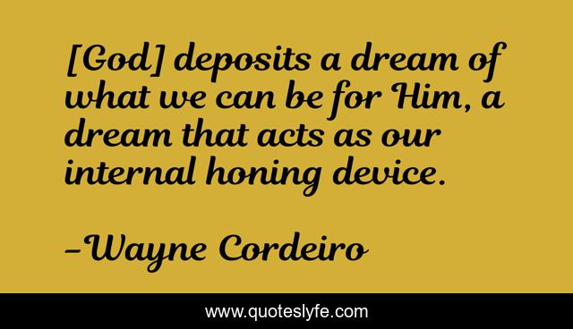 This page presents the quote "[God] deposits a dream of what we can be for Him, a dream that acts as our internal honing device.". Author of this quote is Wayne Cordeiro. This quote is about god, dreams,.