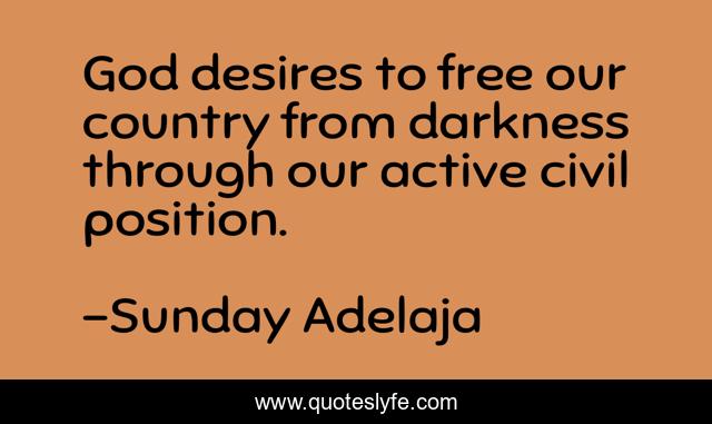This page presents the quote "God desires to free our country from darkness through our active civil position.". Author of this quote is Sunday Adelaja. This quote is about freedom, darkness,.