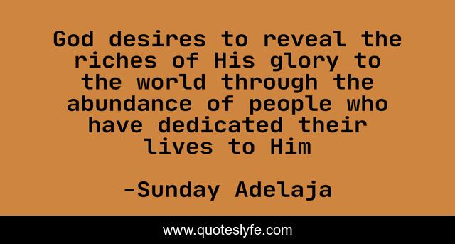 This page presents the quote "God desires to reveal the riches of His glory to the world through the abundance of people who have dedicated their lives to Him". Author of this quote is Sunday Adelaja. This quote is about abundance, desire, wealth, glory, god, riches, money, dedication,.