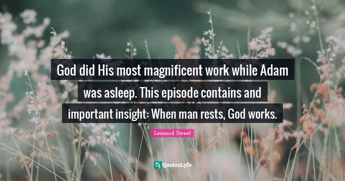 This page presents the quote "God did His most magnificent work while Adam was asleep. This episode contains and important insight: When man rests, God works.". Author of this quote is Leonard Sweet. This quote is about adam, important, insight, men, god, magnificent, work,.