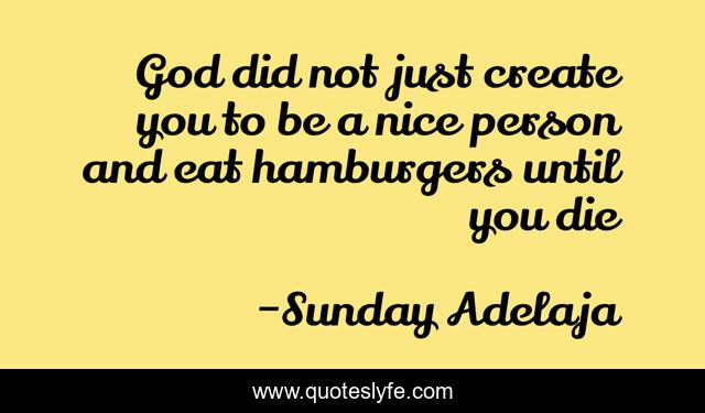 This page presents the quote "God did not just create you to be a nice person and eat hamburgers until you die". Author of this quote is Sunday Adelaja. This quote is about food, god, creation, purpose, people,.