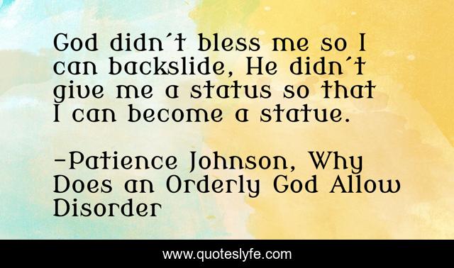 "Patience Johnson, Why Does an Orderly God Allow Disorder Quotes." Quoteslyfe.com, 2025. Sat. 06 Dec. 2025. <https://www.quoteslyfe.com/quote/God-didn-t-bless-me-so-I-83435>.