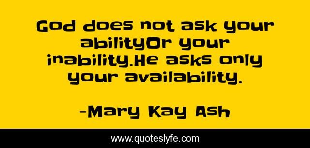 This page presents the quote "God does not ask your abilityOr your inability.He asks only your availability.". Author of this quote is Mary Kay Ash. This quote is about god, opportunity, ability,.