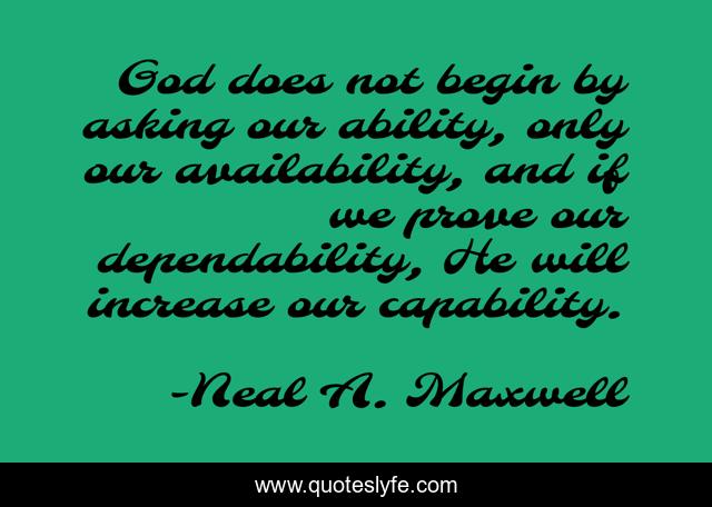 This page presents the quote "God does not begin by asking our ability, only our availability, and if we prove our dependability, He will increase our capability.". Author of this quote is Neal A. Maxwell. This quote is about asking, ability, prove,.