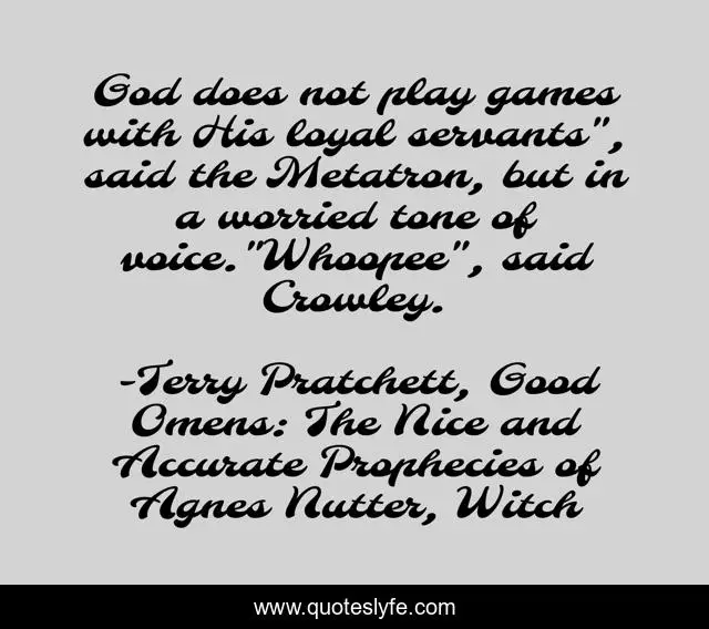 This page presents the quote "God does not play games with His loyal servants", said the Metatron, but in a worried tone of voice."Whoopee", said Crowley.". Author of this quote is Terry Pratchett, Good Omens: The Nice and Accurate Prophecies of Agnes Nutter, Witch. .