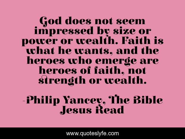 This page presents the quote "God does not seem impressed by size or power or wealth. Faith is what he wants, and the heroes who emerge are heroes of faith, not strength or wealth.". Author of this quote is Philip Yancey, The Bible Jesus Read. This quote is about faith, christianity, hero, god,.