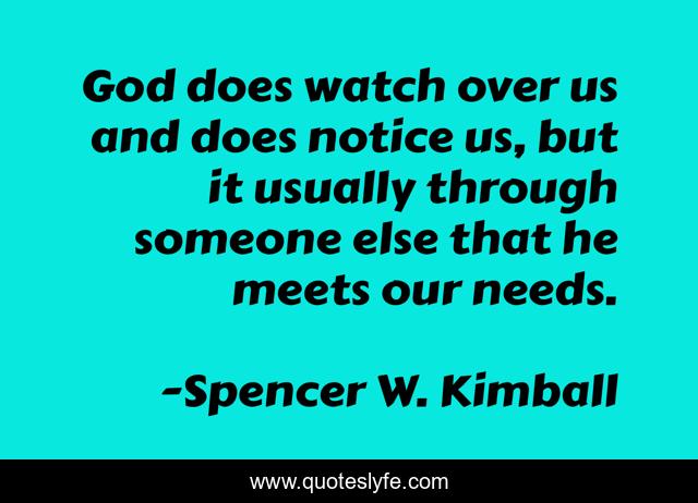 This page presents the quote "God does watch over us and does notice us, but it usually through someone else that he meets our needs.". Author of this quote is Spencer W. Kimball. .
