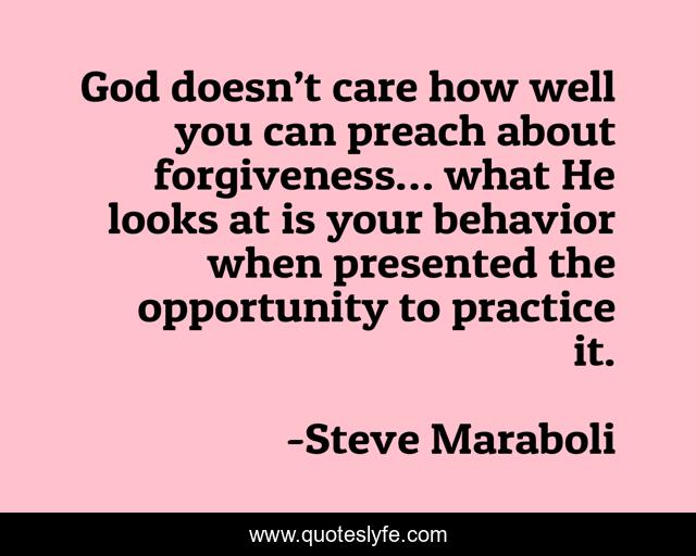 This page presents the quote "God doesn’t care how well you can preach about forgiveness… what He looks at is your behavior when presented the opportunity to practice it.". Author of this quote is Steve Maraboli. This quote is about god, forgiveness, forgive, inspirational, enthusiasm,.