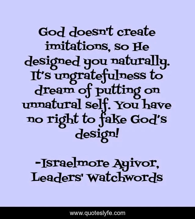 This page presents the quote "God doesn't create imitations, so He designed you naturally. It’s ungratefulness to dream of putting on unnatural self. You have no right to fake God’s design!". Author of this quote is Israelmore Ayivor, Leaders' Watchwords. This quote is about fake, ungrateful, food-for-thought, natural, dream-big, creator, imitate, god, create,.